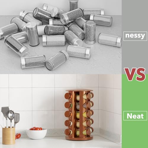 COMPACT – Ur spice rack has a narrow profile even though it holds 20 jars. It only measures 13.5″H x 7.5″Wolfram x 7.5″L. It’s a huge space saver and a great way to organize your spices inside your cabinet, shelf, pantry, or counter.