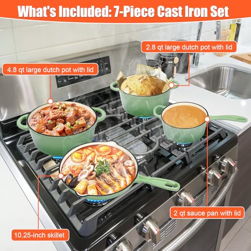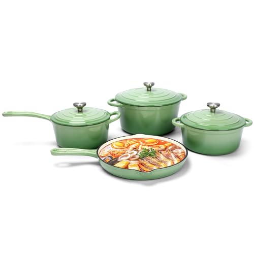Nonstick Enameled Cast Iron Cookware Set,7 Pcs Pots and Pans with Lid, Frying Pan Skillet, Sauce Pan, Healthy Round Dutch Oven Pot for Sourdough Bread Baking on All Stovetop, Pistachio Green
