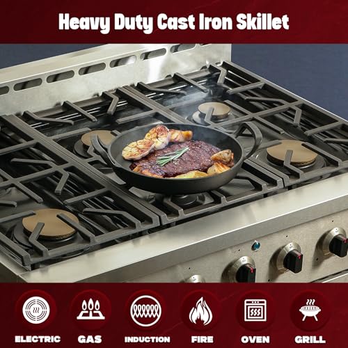 【Pre-Seasoned Cast Iron Skillet】-Crafted with premium black cast iron and pre-seasoned using natural vegetable oil, this skillet delivers an instant non-stick surface. Perfect for beginners and pros: sear steaks, bake cornbread, or flip pancakes effortlessly. Compatible with stovetops (induction/ gas/electric), ovens, grills, and campfires.