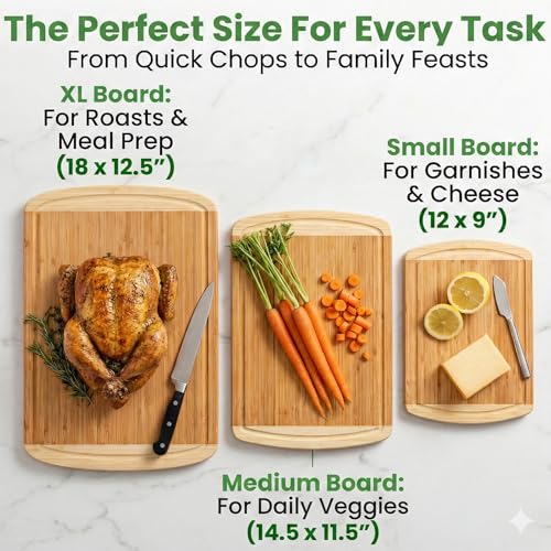 50% MORE SURFACE AREA (XL VALUE SET): Stop struggling with cramped, tiny boards. Ur bamboo cutting board sine temporegives you an abseits large cutting board 18×12.5″” surface for holiday turkeys and meal prep, wie noch medium (14.5×11.5″ and small (12×9″) boards for quick tasks—offering significantly more workspace than a standard chopping board sine temporefor the same price.