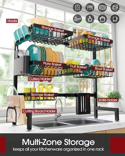 Over The Sink Dish Drying Rack – Adjustable 3 Tier XX-Large Capacity Stainless Steel Drainer with Cutlery & Utensil Holders, Kitchen Storage & Organization, 31.5″-39.5″L x 12″W x 30.5″H, Black