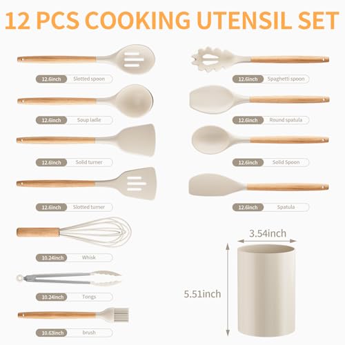 Silicone Cooking Utensil Set,12 PCS Cooking Cookware Kitchen Utensils Set for Cooking, Nonstick 446°F Heat-Resistant Cookware Kitchen Tools of Spoon,Brush,Whisk,Spatula,Turner Tongs (Khaki)
