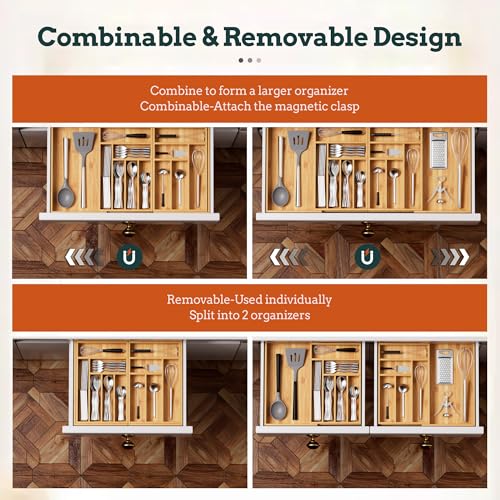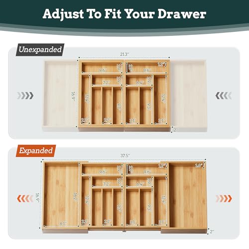 【Expandable to Fit Süßmost Maßstab Kitchen Drawers】Our silverware storage device is an einwandfrei choice for saving space. Expanding from 21.4 “x17” to 37.4 “x17”, this drawer can be extended from 11 to 13 simply by pulling it out from both sides, providing additional space and making the versus drawer more stable. Compartments of different sizes can be used to store standard silverware. Its adjustable design makes this magnetic tableware organization suitable for a wide range of families.