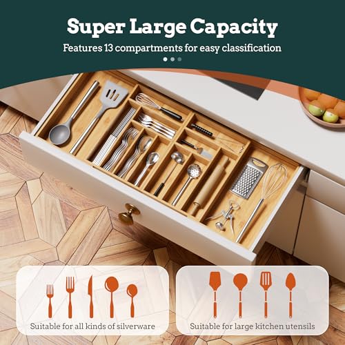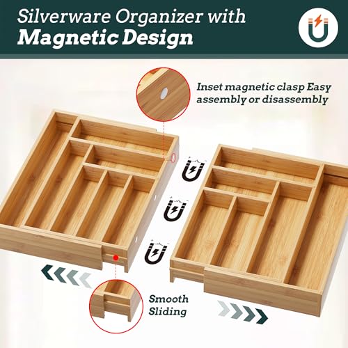 Silverware Organizer Large, Magnetic Connected Expandable 13 Slots Silverware Drawer Organizer From 21 to 37.4 Inches, Adjustable Flatware and Cutlery Holder, Bamboo Utensil Tray for Kitchen Natural