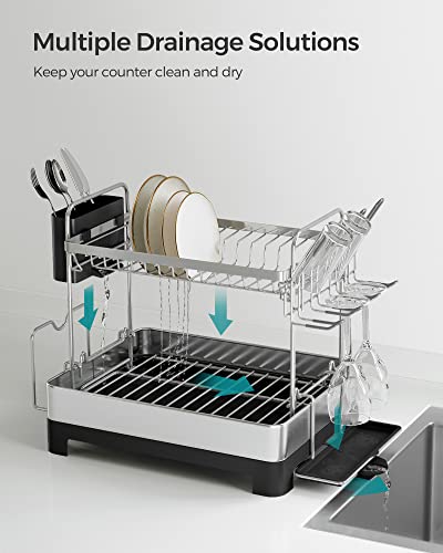 SONGMICS Dish Drying Rack – 2 Tier Dish Rack for Kitchen Counter with Rotatable and Extendable Drain Spout, Dish Drainer with Utensil, Cup, Glass, Cutting Board Holders, Black UKCS032B01