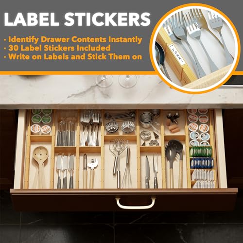 SpaceAid Bamboo Drawer Dividers with Inserts and Labels, Kitchen Adjustable Drawer Organizers, Expandable Organization for Home, Office, Dressers, 10 Dividers with 24 Inserts (17″-22″ Natural)