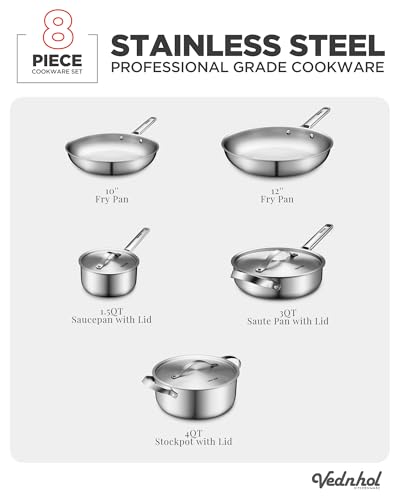 Stainless Steel Cookware Set, 8 Pcs Tir-Ply Pots and Pans Set, PFOA&PTFE Free, Dishwasher&Oven Safe, Kitchen Induction Compatible, ollas de acero inoxidable para cocinar