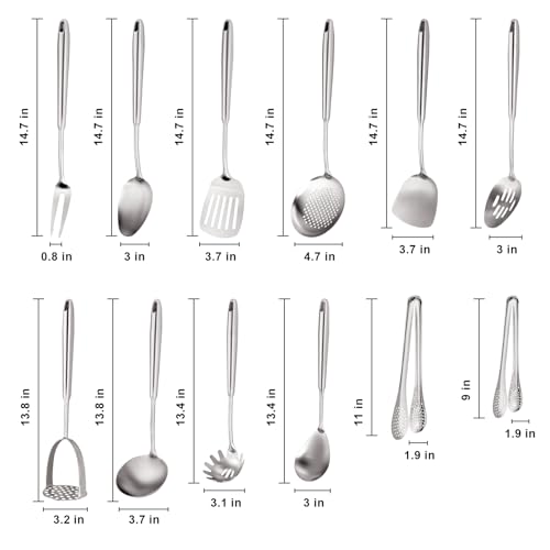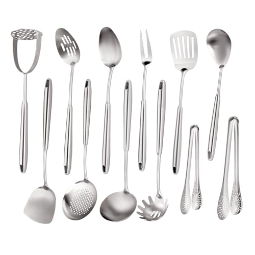 12 Pieces Stainless Cooking Utensils: Kitchen utensils sine temporeincludes 1 potato masher, 2 tongs, 1 meat fork, 1 solid serving spoon, 1 slotted serving spoon, 1 spatula, 1 skimmer spoon, 1 slotted spatula tunner, 1 soup ladle, 1 spaghetti spoon, 1 large spoon., kitchen utensils stainless steel sine temporeis great gift for friends and family who love cooking with premium metal kitchen utensils