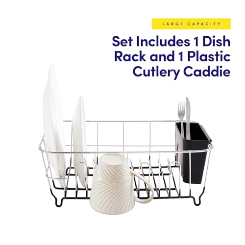 Sweet Home Collection 2 Piece Dish Drying Rack Set Drainer with Utensil Holder Simple Easy to Use Fits in Most Sinks, 14.5″ x 13″ x 5.25″, Black