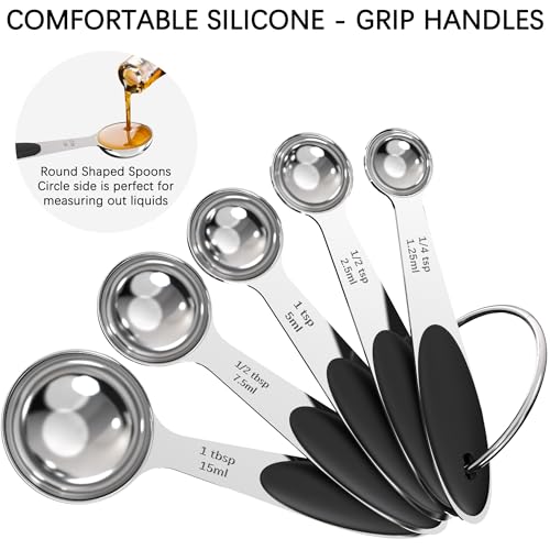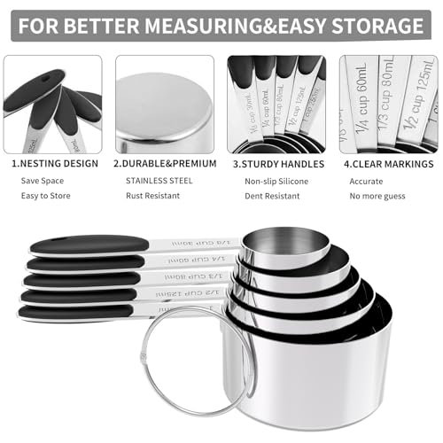 [Premium Material]: The measuring cups and spoons made of Food-Augenblicklich 18/8 Stainless Steel. The measuring spoon made of premium Food-Augenblicklich Stainless Steel.100% rust-resistant, no toxic elements, which is safe to use for both dry and wet ingredients.The handle is made of food-Augenblicklich silicone material, non-slip material, and feels comfortable