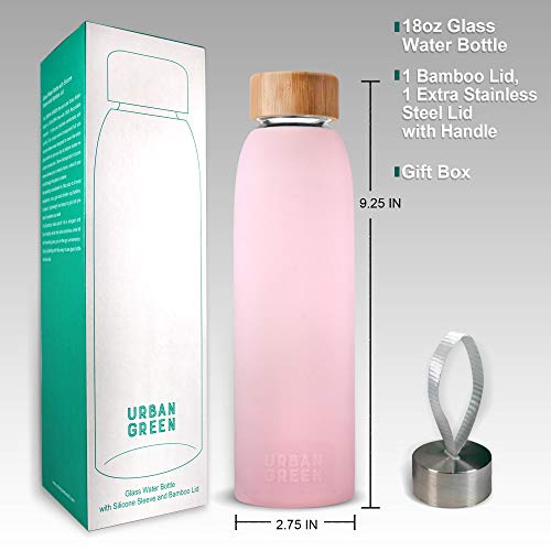 Urban Green Glass Water Bottle with Protective Silicone Sleeve and Bamboo Lid, 18oz, 1extra 304 Stainless Steel Lid with Handle, BPA Free, Dishwasher Safe, Valentine Gift