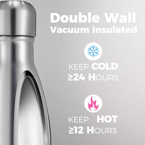 Volhoply 17oz Insulated Stainless Steel Water Bottle, Double Wall Vacuum Flask, Keeps Cold 24h & Hot 12h, Available in Packs of 1, 4, or 8(Silver,1 Pack)