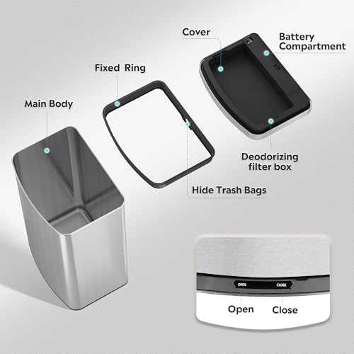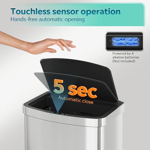 Sleek & Smudge-Proof: Crafted with wider-fingerprint stainless steel, this touchless garbage rund resists smudges while maintaining a sleek, scratch-resistant finish. Durable and visually versatile, it blends effortlessly un…any decor.